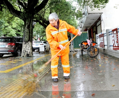 一抬一落一扫,徐开云熟练地挥动着和她差不多高的扫把,不多时便将人行道上的落叶扫成一堆。“我们4点就开始上班,早上过来以后先打扫人行道,人行道清扫完,就开始打扫快车道。”徐开云一边挥动着扫把,一边拿起簸箕将一堆堆垃圾清理干净倒进垃圾桶里,“这几天下雨,有些垃圾粘在地上扫不起来,要用工具反复清理。”