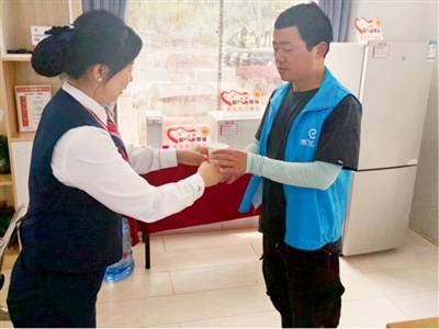 5月3日上午,外面倾盆大雨,大风刮得呼呼响。刘阿姨将簸箕、扫帚收拾停当,拍了拍身上的雨水,再次走进淦河大道营业厅爱心驿站。一进门,营业厅人员微笑相迎,递过一热杯水。“阿姨,您喝点水歇会儿。” “谢谢!”刘阿姨刚接过水、坐在沙发上。这时,又进来一位快递小哥。“您在这儿歇着啦,我的手机快没电了,进来充会儿电。”快递小哥和刘阿姨亲切地打着招呼。