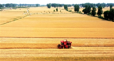5月20日,大型收割机在河南驻马店市驿城区朱古洞乡的麦田里作业。