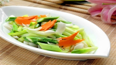 咸宁人在吃这方面更讲究原汁原味。用刮刀去掉百合下半部分的外皮,剥好浸入清水备用。芦笋斜切段,水里放适量盐和油,水沸了放入切好的芦笋焯水。油锅烧热,加适量盐,芦笋、百合和切好的蒜瓣同时放入锅里,然后快速翻炒几下至百合微微透明即可。