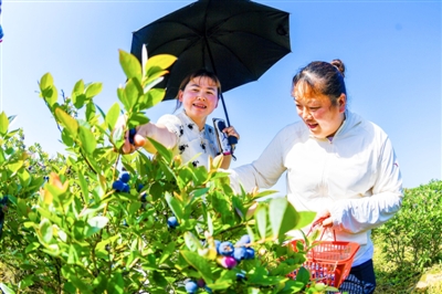 5月14日,咸安区贺胜桥镇贺胜桥村3组梦情谷采摘园内,市民正在体验蓝莓采摘乐趣。该果园占地160亩,种植草莓、蓝莓、葡萄、圣女果等水果,吸引了众多游客市民前来观光、采摘。
