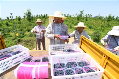 5月17日,在赤壁市余家桥乡大丰收果业蓝莓种植基地,村民将采摘的蓝莓装到运输车上。
