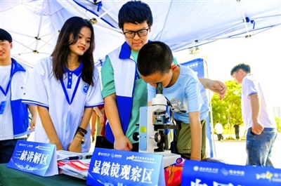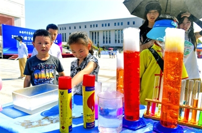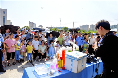 在市科技局展台前,“小星球未来学院”的一场科普实验秀为现场的孩子们带来了精彩有趣的“科普大餐”,将科学知识与艺术形式巧妙融合,把复杂的物理、化学知识通俗形象化展示,孩子们沉浸在奇妙有趣的科学世界里,发出阵阵欢呼。