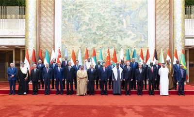 习近平同巴林国王哈马德、埃及总统塞西、突尼斯总统赛义德、阿联酋总统穆罕默德、阿盟秘书长盖特以及22位阿拉伯国家代表团团长一一握手并集体合影。
