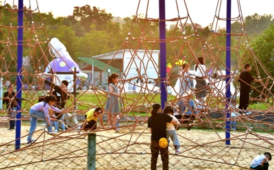 近日,武汉松鼠部落森林假日公园,孩子们在家长的陪同下体验园内的游乐设施, 欢度愉快假日。 记者 夏正锋 摄