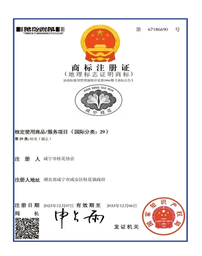 (2)2023 年 12 月 07 日,国家知识产权局认定“咸宁桂花XIANNINGGUIHUA”商标为地理标志证明商标;