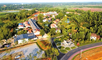 自高处望向朱砂村,只见柏油道路穿村而过,一栋栋房屋掩映在茂盛生长的高大树木间,不时可见两三村民结伴而行,脸上笑意盈盈,一幅人与自然和谐共生的美好画卷在眼前徐徐展开。