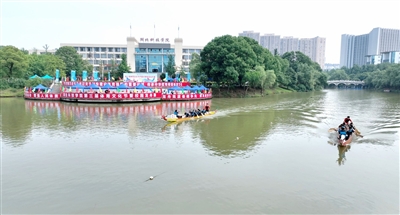 6月2日,湖北科技学院第三届体育文化节开幕式暨校园龙舟赛在校内揽月湖举行,来自学校各院系的16支龙舟代表队在湖面劈波斩浪、竞相角逐,吸引众多师生为参赛队员打气助威,加油声、喝彩声响彻湖面。 记者 刘震 摄