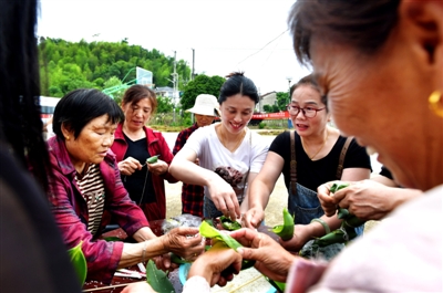 6月6日,赤壁市茶庵岭镇罗峰村11组,当地干群正在一起包粽子。