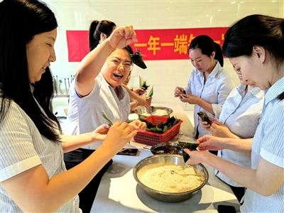 活动当天,分行邀请会包粽的员工当老师,指导其他员工亲手制作凝聚中华民族共同记忆的传统美食。粽叶飞舞,马莲穿梭,员工们互帮互助、“以老带新”,共享劳动成果,分享甜蜜喜悦。
