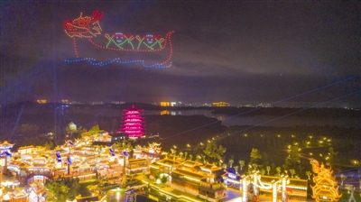 6月10日,端午节,恋江湖·嘉鱼不夜城上空,400台无人机演绎变换出端午安康、 龙舟、 屈原、 嘉鱼欢迎您等数种图形,为现场游客带来一场视觉盛宴,令人叹为观止。 雷平 摄(影像咸宁)