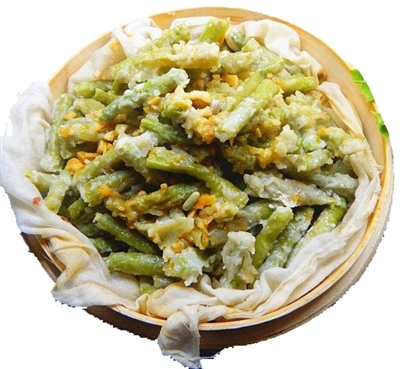传统粉蒸豆角:首先,将豆角洗净并掰成小段,沥干水分备用,土豆切滚刀块,油锅加热后,将豆角炸至外皮起皱,略加一点点盐入味,将土豆和豆角混合,加入蒸肉米粉、大料、盐和糖入味。最后上锅蒸30分钟即可。