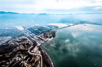 2023年12月1日,船舶有序通过三峡双线五级船闸(无人机照片)。