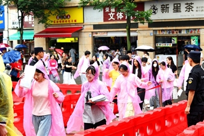 6月20日,虽然下着雨,但中考市实验外国语学校考点场外秩序井然。