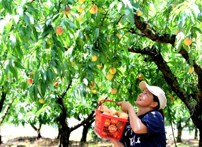 6月13日,嘉鱼县新街镇嘉多宝生态果蔬专业合作社桃园内,枝头挂满各种桃子,成熟的油蟠桃、黄桃和蜜桃散发出浓浓的果香。该合作社基地面积300亩,种有桃、葡萄、桔、橙、梨、枣等40余种时鲜水果品种,可为游客提供一年四季不间断的采摘。记者 陈红菊 通讯员 卢建 李雄 摄
