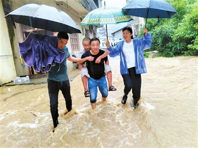 6月21日晚,咸安区永安街道社区工作人员、“桂乡管家”顶着如瀑的大雨,蹚着近膝的雨水,挨家挨户提醒居民注意自身和财产安全,及时将车辆转移到高地势区域,避免损坏。