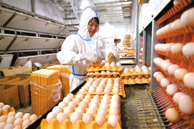 6月2日,在通城县马港镇石溪村,湖北精源农业开发有限公司员工在智能化养鸡场生产线上忙着分拣、包装新鲜鸡蛋。