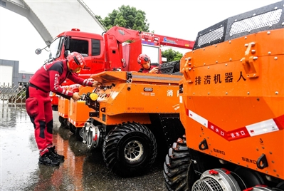 6月28日,城区体育中心门前,市消防救援支队队员正在对两台排涝机器人进行检查,确保设备运行正常,时刻准备应对强降雨。记者 张仰强 摄