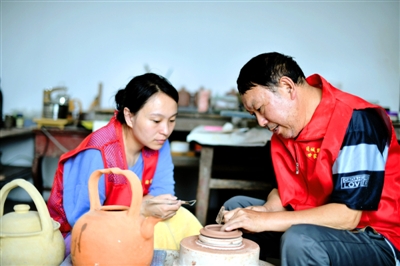日前,在通城县五里镇尖山村非遗陶瓷传承基地,陶瓷非遗传承人杨联云向女儿杨洋传授陶瓷花篮制作技艺。