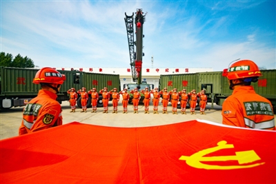 武警吉林总队机动支队组织党员开展重温入党誓词活动(6月29日摄)。