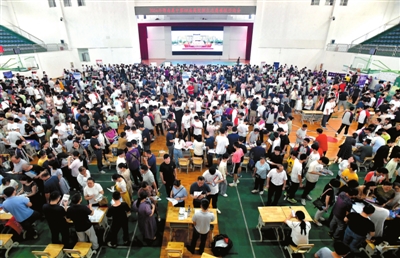 6月30日,鄂南高中体育馆,该校第四届高校招生志愿填报咨询会举行,现场3000多名考生和家长进场咨询,81所省内外知名高校应邀参会。