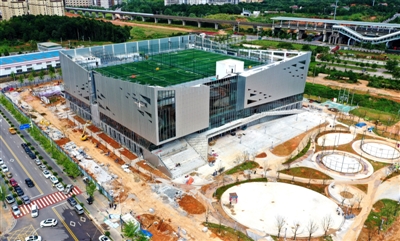 7月4日,全民健身中心项目现场,工人们正在进行绿化、硬化道路等收尾工作。