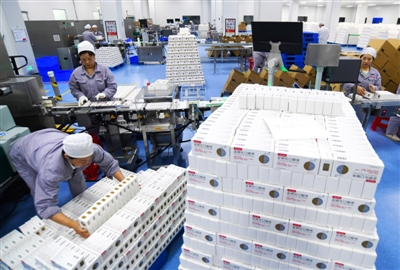 7月8日,咸安经济开发区,真奥金银花药业有限公司生产车间,4条新建的金银花口服液软包装生产线正开足马力生产,工人们忙着打包、装箱作业。