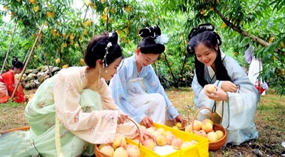 闯王镇大源村和谐种养殖专业合作社水蜜桃种植基地里,一个个硕大、粉红的桃子垂坠枝头。不少游客穿梭在果园里,拍照打卡,体验水果采摘的乐趣。