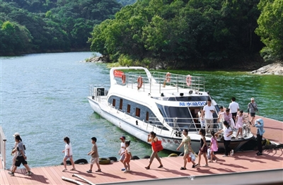 炎炎夏日,骄阳似火。7月20日,赤壁陆水湖景区,游客登船游湖,在湖光山色中领略大自然的美好。