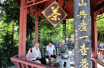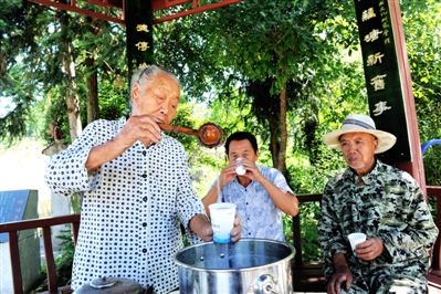 凉亭中央的石桌上,大半缸川芎凉茶静静散发着香气。村民们三五成群围坐一起,边喝凉茶边消暑。一旁,满头银发的徐桂梅则摇着蒲扇提醒大家慢点喝。