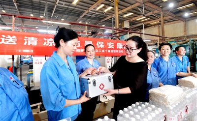 7月25日,湖北三环汽车方向机有限公司车间,咸宁高新区总工会工作人员将消暑降温用品送到一线职工手中。