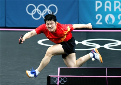 8月4日,樊振东在比赛中。 当日,在巴黎奥运会乒乓球男单决赛中,中国选手樊振东4比1战胜瑞典选手莫雷高德,夺得金牌。据新华社