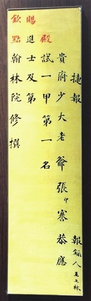 江苏省江海博物馆陈列有近代实业家、政治家、教育家张謇状元捷报。1894年,慈禧太后60大寿特设恩科会试。张謇奉父命第五次进京应试,在清朝重臣翁同龢的提携下,高中一甲第一名状元,授以六品翰林院修撰官职。捷报上书:“贵府少大老爷张謇恭应殿试一甲第一名,赐进士及第,钦点翰林院修撰。”还写有“报录人王上林”六字。
