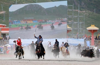 近日,青海省玉树藏族自治州玉树市首届“江源杯”牦牛竞赛在玉树赛马场进行,60名参赛选手驭牛疾奔。 (本报综合)