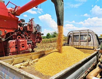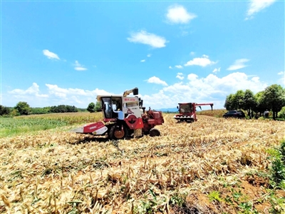本报讯 通讯员李卫东、雷莹莹报道:盛夏时节,骄阳似火。7月30日,双溪桥镇毛祠村的1000多亩玉米陆续成熟,进入采收期,种植大户李龙辉抢抓农时,从河南老家调来联合收割机,全面开启了收获模式。
