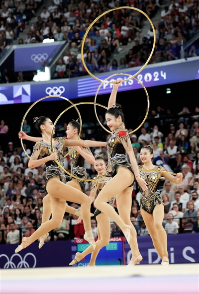 ①8月10日,中国队在比赛中。当日,在巴黎奥运会艺术体操项目集体全能决赛中,中国队获得冠军。