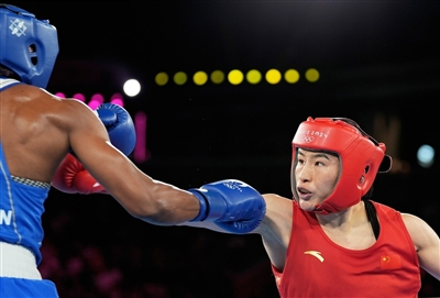 ③8月10日,李倩(右)与拜伦在比赛中。当日,在巴黎奥运会拳击项目女子75公斤级金牌赛中,中国选手李倩战胜巴拿马选手拜伦,夺得金牌。