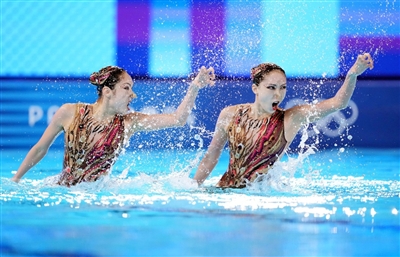 ④8月10日,王柳懿/王芊懿在比赛中。当日,巴黎奥运会花样游泳双人项目的最后一项比赛双人自由自选在巴黎奥林匹克水上运动中心举行。中国组合王柳懿/王芊懿夺得冠军。 据新华社