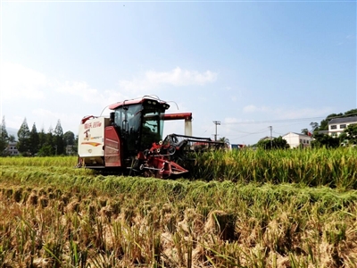 图① 8月11日,在四川省达州市渠县宝城镇,村民驾驶收割机收获有机水稻。