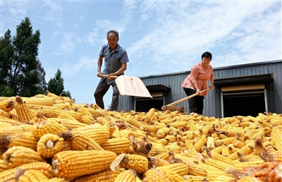 图② 8月11日,四川省内江市东兴区杨家镇观音井村,粮农在晒场堆放玉米。