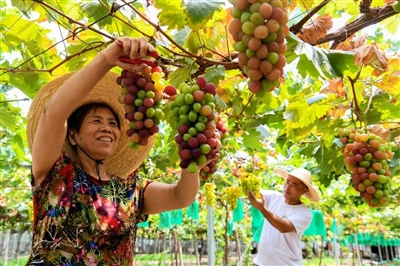 图④ 8月12日,浙江省金华市浦江县黄宅镇蒋才文村,村民在大棚里采摘葡萄。