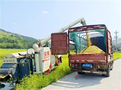 8月13日,咸安区3万余亩再生稻陆续成熟,喜获丰收,种植户趁着晴好天气抢收再生稻,确保颗粒归仓。