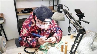 雕刻工作室里,刻刀划过竹子发出吱吱声响,桌面上堆满刀刻工具,灯架和工作台上落满薄薄的竹屑,吴宇却只专注于手中的竹子,耐心细致地雕刻,分不开半点神来。
