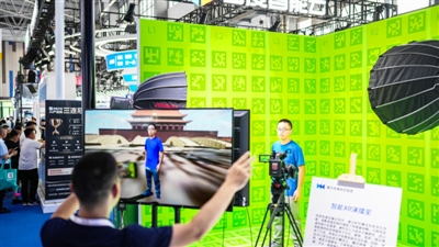 8月28日,参观者在数博会展馆内体验智能XR演播室。