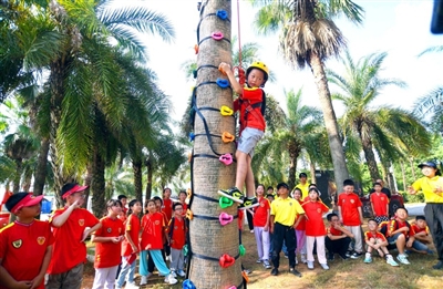8月22日,嘉鱼蜜泉湖旅游度假区,碧绿的湖水、细软的银色沙滩、翠绿的棕榈树,一群孩子来到湖边小树林,在教练指导下勇敢攀爬,挑战自我。