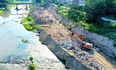 近日,通城县石南镇铁柱港河,施工人员正在进行河道边坡施工。