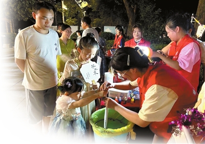 “路过摊位的时候看到这个图案,那种古韵一下子就击中我了。”一位参与漆扇DIY活动的居民告诉记者,自己读书时玩过漂染的游戏,这次用宣纸漆料,看着图案一点一点浮现,感觉既熟悉又新奇。
