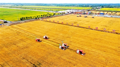 咸安区向阳湖现代农业科技示范区,8200亩整齐连片的稻田,一眼望不到头;155亩“黄花粘”稻谷收割区内一片金黄,沉甸甸的稻穗压弯了腰。伴随着20台智慧农机的轰鸣,开镰仪式启动,秋收序幕拉开。
