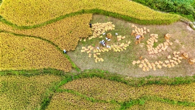 9月13日,在通城县关刀镇东山村,高山梯田迎来丰收季,金黄色的水稻铺展在层层叠叠的梯田中,与错落有致的村庄和连绵起伏的青山相映成景,村民抓住农时抢收、抢晒,呈现出一幅山村丰收的画卷。 刘建平 摄(影像咸宁)