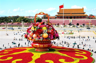 9月25日拍摄的天安门广场“祝福祖国”巨型花篮。